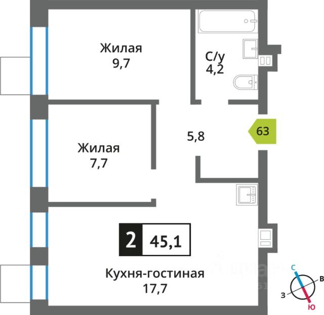 Прекрасная квартира в ЖК Молодежный. Планировка квартиры (Евро два) включает в себя: отдельно изолированную спальню, просторную кухню-студию с выходом на, не менее просторную, застекленную лоджию (длиной во всю квартиру 7,3 кв.м.) и совмещенный санузел (более подробно можно рассмотреть на плане (есть среди фото)). В квартире выполнен качественный ремонт. Современный встроенный кухонный гарнитур, с посудомоечной машиной, варочной панелью, духовым шкафом и холодильником. В квартире установлен кондиционер. Вся бытовая техника и мебель остаются. Дом оборудован современными бесшумными лифтами. Подъезд чист и ухожен, находится под круглосуточным видеонаблюдением, также дежурит консьерж. Инфраструктура хорошо сложена, в шаговой доступности супермаркеты, банки, школы, пункты выдачи заказов, фитнес, бассейн. Отличная транспортная доступность, в шаговой доступности станция МЦД Пенягино (10 минут до ст. Тушинская). Квартира в собственности более 10-ти лет, приобреталась по ДДУ у застройщика. 1 взр собственник, никто не прописан. Прямая продажа.