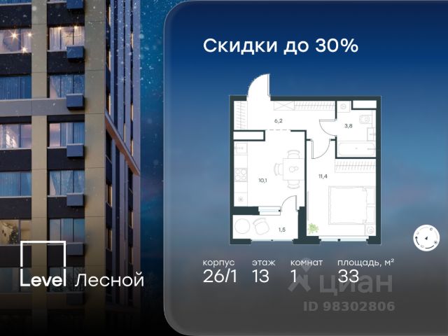 Цена указана с учётом скидки при 100%-й оплате, несубсидированной ипотеке, рассрочке (кроме программы "Рассрочка 0%"). В районе, утопающем в густой зелени лесов, многочисленных парков и скверов, продаётся 1-комнатная квартира площадью 39.50 кв.м без отделки. Квартира расположена на 13 этаже в жилом комплексе комфорт-класса Level Лесной (компания Level Group/Левел групп). Отличная транспортная доступность: - 25 мин. пешком до станции метро "Пятницкое шоссе"; - 28 мин. на автобусе до станции метро и МЦД-2 "Волоколамская"; - 11 мин. на авто до МКАД; - 25 мин. на авто до ТТК. Продуманный архитектурный проект: - Концепция проекта Level Лесной от бюро СПИЧ; - Высотность комплекса до 15 этажей с уникальными видами на лесные массивы и город; - Высота потолков до 3 м; - Современные окна высотой до 1,6 м, в части квартир предусмотрены окна в пол. Высота подоконников 0,6 м; Расположение: Level Лесной строится в зелёной зоне ближайшего Подмосковья, г.о. Красногорск в посёлке Отрадное. Шаговая и автомобильная доступность до метро и больших транспортных артерий города. За 25 минут вы дойдёте до станции метро "Пятницкое шоссе", а за 20 минут на машине сможете доехать до станции метро "Тушинская". Район окружен роскошной зеленью лесов и парковых зон, занимающих территорию свыше 1 000 гектаров. Помимо благоприятной экологии, здесь множество возможностей для активного отдыха и поддержания физической формы. Облагороженная территории с полностью развитой инфраструктурой. На территории проекта находится детский сад и школа "Светлые Горы", которая входит в список лучших частных школ от Forbes Education (по данным на 2023г.). Кроме того, в пешей доступности расположено ещё 8 детских садов, а также запланировано открытие современной муниципальной школы. В непосредственной близости находятся сетевые супермаркеты и локальные магазины, аптеки, клиники, почта, библиотека, салоны красоты, рестораны, спортивные и творческие секции, развивающие детские центры. В 12 минутах пешком расположен торговый парк "Отрада" с продуктовым и строительным гипермаркетами, магазинами, кинотеатром и развлечениями для детей. Внутренняя инфраструктура: Мы знаем, как важно, чтобы магазины и сервисы были всегда рядом. В сданных корпусах Level Лесной уже расположена полностью готовая развитая инфраструктура. На первых этажах корпуса 27 предусмотрено ещё 14 коммерческих помещений. Благоустройство: Продуманное пространство и аура приватного европейского городка рождают чувство лёгкости и расслабления у каждого, кто попадает на территорию проекта. Концепцию общественных площадок разработали в партнёрстве два архитектурных бюро: Highlight Architecture и SCAPE. В безопасных дворах без машин каждый обязательно найдёт себе место для вдохновения, отдыха и спорта.