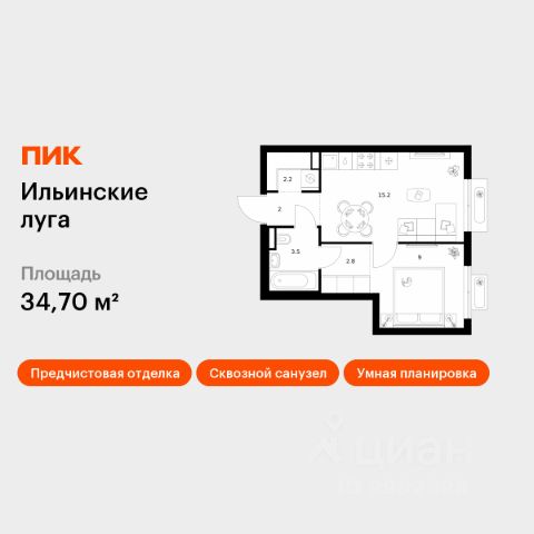 Продаётся 1-комн. квартира площадью 35,2 кв.м на 2 этаже 9 этажного дома (Корпус 4.3, Секция 6) проекта ПИК Ильинские луга. Светлый просторный подъезд на уровне земли, функциональная планировка, большие окна, предчистовая отделка. Жилой район "Ильинские луга" находится в 10 километрах от МКАД по Новорижскому шоссе, в 20 минутах на автомобиле от станций метро "Волоколамская", "Тушинская" и "Строгино". В будущем ближе к проекту, в 9 минутах пути на машине, откроется станция "Ильинская" Рублёво-Архангельской линии, которая будет соединять Арбатско-Покровскую линию и Большую кольцевую линию. Сейчас в квартале начались продажи в корпусах 3.2, 3.3, 3.4, 3.5 и 3.6. "Ильинские луга" — масштабный проект, в который входит девять детских садов, четыре школы и поликлиника. Он строится в престижном и экологичном районе среди лесов и памятников природы. За 5 минут от жилого квартала можно доехать до Рублёво-Успенского шоссе, а за 30 минут — до центра Москвы. До крупного торгового центра "РИГАМОЛЛ" всего 5 минут на автомобиле, а до ТЦ "Твой дом" и гипермаркета "Глобус" — 10 минут. В "Ильинских лугах" строятся только девятиэтажные дома — такая архитектура соответствует спокойной жизни за городом. В каждом дворе-парке есть места для отдыха, детские и спортивные площадки. А ещё, здесь уже открыт большой PlayHub "Гравити" — современное игровое пространство с космической тематикой, холмами, зонами для игр и отдыха жителей любого возраста. На первых этажах уже работают магазины, кафе и пекарни. Места для отдыха от "Ильинских лугов" тоже недалеко: 10 минут на машине — и вы в музее-усадьбе "Архангельское". Также рядом находится Лохин остров — памятник природы, где водятся речные черепахи, есть места для кемпинга и возможность сплавиться по реке. Артикул 1012318 (Застройщик ООО "СЗ "ГРАДОЛИМП")