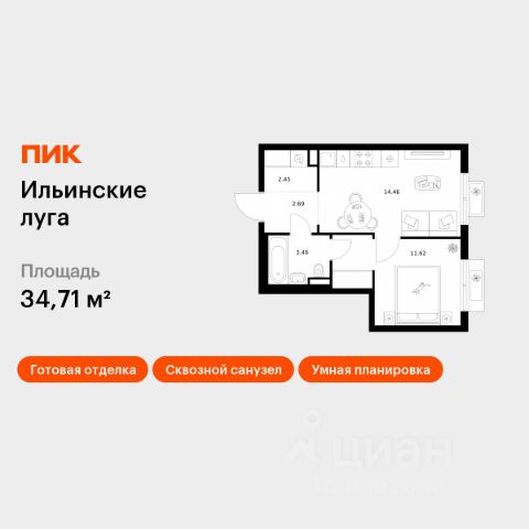 Продаётся 1-комн. квартира площадью 34,1 кв.м на 5 этаже 9 этажного дома (Корпус 4.2, Секция 3) проекта ПИК Ильинские луга. Светлый просторный подъезд на уровне земли, функциональная планировка, большие окна, предчистовая отделка. Жилой район "Ильинские луга" находится в 10 километрах от МКАД по Новорижскому шоссе, в 20 минутах на автомобиле от станций метро "Волоколамская", "Тушинская" и "Строгино". В будущем ближе к проекту, в 9 минутах пути на машине, откроется станция "Ильинская" Рублёво-Архангельской линии, которая будет соединять Арбатско-Покровскую линию и Большую кольцевую линию. Сейчас в квартале начались продажи в корпусах 3.2, 3.3, 3.4, 3.5 и 3.6. "Ильинские луга" — масштабный проект, в который входит девять детских садов, четыре школы и поликлиника. Он строится в престижном и экологичном районе среди лесов и памятников природы. За 5 минут от жилого квартала можно доехать до Рублёво-Успенского шоссе, а за 30 минут — до центра Москвы. До крупного торгового центра "РИГАМОЛЛ" всего 5 минут на автомобиле, а до ТЦ "Твой дом" и гипермаркета "Глобус" — 10 минут. В "Ильинских лугах" строятся только девятиэтажные дома — такая архитектура соответствует спокойной жизни за городом. В каждом дворе-парке есть места для отдыха, детские и спортивные площадки. А ещё, здесь уже открыт большой PlayHub "Гравити" — современное игровое пространство с космической тематикой, холмами, зонами для игр и отдыха жителей любого возраста. На первых этажах уже работают магазины, кафе и пекарни. Места для отдыха от "Ильинских лугов" тоже недалеко: 10 минут на машине — и вы в музее-усадьбе "Архангельское". Также рядом находится Лохин остров — памятник природы, где водятся речные черепахи, есть места для кемпинга и возможность сплавиться по реке. Артикул 1015520 (Застройщик ООО "СЗ "ГРАДОЛИМП")