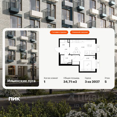 Продаётся 1-комн. квартира площадью 36,3 кв.м на 5 этаже 9 этажного дома (Корпус 2.9, Секция 2) проекта ПИК Ильинские луга. Светлый просторный подъезд на уровне земли, функциональная планировка, большие окна, c отделкой. Жилой район "Ильинские луга" находится в 10 километрах от МКАД по Новорижскому шоссе, в 20 минутах на автомобиле от станций метро "Волоколамская", "Тушинская" и "Строгино". В будущем ближе к проекту, в 9 минутах пути на машине, откроется станция "Ильинская" Рублёво-Архангельской линии, которая будет соединять Арбатско-Покровскую линию и Большую кольцевую линию. Сейчас в квартале начались продажи в корпусах 3.2, 3.3, 3.4, 3.5 и 3.6. "Ильинские луга" — масштабный проект, в который входит девять детских садов, четыре школы и поликлиника. Он строится в престижном и экологичном районе среди лесов и памятников природы. За 5 минут от жилого квартала можно доехать до Рублёво-Успенского шоссе, а за 30 минут — до центра Москвы. До крупного торгового центра "РИГАМОЛЛ" всего 5 минут на автомобиле, а до ТЦ "Твой дом" и гипермаркета "Глобус" — 10 минут. В "Ильинских лугах" строятся только девятиэтажные дома — такая архитектура соответствует спокойной жизни за городом. В каждом дворе-парке есть места для отдыха, детские и спортивные площадки. А ещё, здесь уже открыт большой PlayHub "Гравити" — современное игровое пространство с космической тематикой, холмами, зонами для игр и отдыха жителей любого возраста. На первых этажах уже работают магазины, кафе и пекарни. Места для отдыха от "Ильинских лугов" тоже недалеко: 10 минут на машине — и вы в музее-усадьбе "Архангельское". Также рядом находится Лохин остров — памятник природы, где водятся речные черепахи, есть места для кемпинга и возможность сплавиться по реке. Артикул 936110 (Застройщик ООО "СЗ "ГРАДОЛИМП")