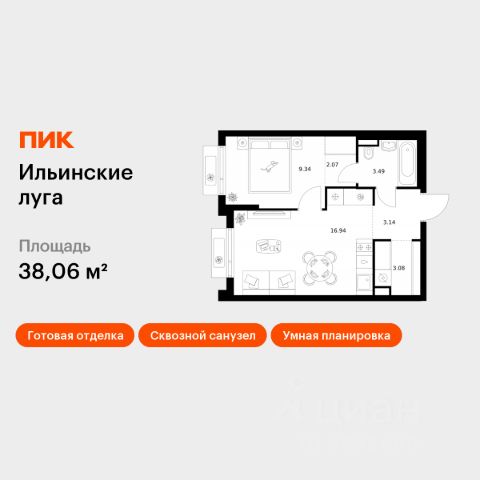 Продаётся 1-комн. квартира площадью 34,4 кв.м на 6 этаже 9 этажного дома (Корпус 3.5, Секция 3) проекта ПИК Ильинские луга. Светлый просторный подъезд на уровне земли, функциональная планировка, большие окна, предчистовая отделка. Жилой район "Ильинские луга" находится в 10 километрах от МКАД по Новорижскому шоссе, в 20 минутах на автомобиле от станций метро "Волоколамская", "Тушинская" и "Строгино". В будущем ближе к проекту, в 9 минутах пути на машине, откроется станция "Ильинская" Рублёво-Архангельской линии, которая будет соединять Арбатско-Покровскую линию и Большую кольцевую линию. Сейчас в квартале начались продажи в корпусах 3.2, 3.3, 3.4, 3.5 и 3.6. "Ильинские луга" — масштабный проект, в который входит девять детских садов, четыре школы и поликлиника. Он строится в престижном и экологичном районе среди лесов и памятников природы. За 5 минут от жилого квартала можно доехать до Рублёво-Успенского шоссе, а за 30 минут — до центра Москвы. До крупного торгового центра "РИГАМОЛЛ" всего 5 минут на автомобиле, а до ТЦ "Твой дом" и гипермаркета "Глобус" — 10 минут. В "Ильинских лугах" строятся только девятиэтажные дома — такая архитектура соответствует спокойной жизни за городом. В каждом дворе-парке есть места для отдыха, детские и спортивные площадки. А ещё, здесь уже открыт большой PlayHub "Гравити" — современное игровое пространство с космической тематикой, холмами, зонами для игр и отдыха жителей любого возраста. На первых этажах уже работают магазины, кафе и пекарни. Места для отдыха от "Ильинских лугов" тоже недалеко: 10 минут на машине — и вы в музее-усадьбе "Архангельское". Также рядом находится Лохин остров — памятник природы, где водятся речные черепахи, есть места для кемпинга и возможность сплавиться по реке. Артикул 1001736 (Застройщик ООО "СЗ "ГРАДОЛИМП")