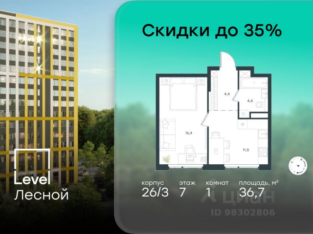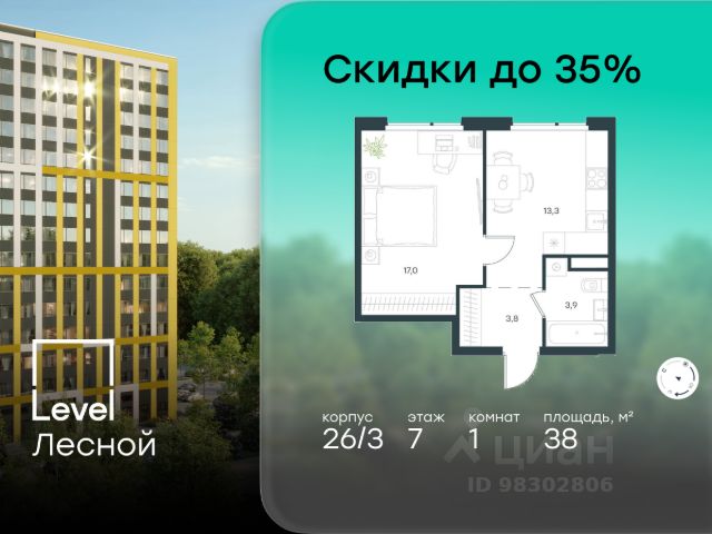 Цена указана с учётом скидки при 100%-й оплате, несубсидированной ипотеке, рассрочке (кроме программы "Рассрочка 0%"). В районе, утопающем в густой зелени лесов, многочисленных парков и скверов, продаётся 1-комнатная квартира площадью 38.00 кв.м без отделки. Квартира расположена на 7 этаже в жилом комплексе комфорт-класса Level Лесной (компания Level Group/Левел групп). Отличная транспортная доступность: - 25 мин. пешком до станции метро "Пятницкое шоссе"; - 28 мин. на автобусе до станции метро и МЦД-2 "Волоколамская"; - 11 мин. на авто до МКАД; - 25 мин. на авто до ТТК. Продуманный архитектурный проект: - Концепция проекта Level Лесной от бюро СПИЧ; - Высотность комплекса до 15 этажей с уникальными видами на лесные массивы и город; - Высота потолков до 3 м; - Современные окна высотой до 1,6 м, в части квартир предусмотрены окна в пол. Высота подоконников 0,6 м; Расположение: Level Лесной строится в зелёной зоне ближайшего Подмосковья, г.о. Красногорск в посёлке Отрадное. Шаговая и автомобильная доступность до метро и больших транспортных артерий города. За 25 минут вы дойдёте до станции метро "Пятницкое шоссе", а за 20 минут на машине сможете доехать до станции метро "Тушинская". Район окружен роскошной зеленью лесов и парковых зон, занимающих территорию свыше 1 000 гектаров. Помимо благоприятной экологии, здесь множество возможностей для активного отдыха и поддержания физической формы. Облагороженная территории с полностью развитой инфраструктурой. На территории проекта находится детский сад и школа "Светлые Горы", которая входит в список лучших частных школ от Forbes Education (по данным на 2023г.). Кроме того, в пешей доступности расположено ещё 8 детских садов, а также запланировано открытие современной муниципальной школы. В непосредственной близости находятся сетевые супермаркеты и локальные магазины, аптеки, клиники, почта, библиотека, салоны красоты, рестораны, спортивные и творческие секции, развивающие детские центры. В 12 минутах пешком расположен торговый парк "Отрада" с продуктовым и строительным гипермаркетами, магазинами, кинотеатром и развлечениями для детей. Внутренняя инфраструктура: Мы знаем, как важно, чтобы магазины и сервисы были всегда рядом. В сданных корпусах Level Лесной уже расположена полностью готовая развитая инфраструктура. На первых этажах корпуса 27 предусмотрено ещё 14 коммерческих помещений. Благоустройство: Продуманное пространство и аура приватного европейского городка рождают чувство лёгкости и расслабления у каждого, кто попадает на территорию проекта. Концепцию общественных площадок разработали в партнёрстве два архитектурных бюро: Highlight Architecture и SCAPE. В безопасных дворах без машин каждый обязательно найдёт себе место для вдохновения, отдыха и спорта.