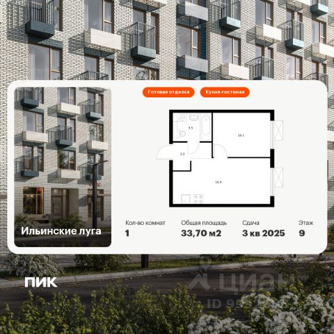 Продаётся 1-комн. квартира площадью 34,1 кв.м на 9 этаже 9 этажного дома (Корпус 4.2, Секция 3) проекта ПИК Ильинские луга. Светлый просторный подъезд на уровне земли, функциональная планировка, большие окна, предчистовая отделка. Жилой район "Ильинские луга" находится в 10 километрах от МКАД по Новорижскому шоссе, в 20 минутах на автомобиле от станций метро "Волоколамская", "Тушинская" и "Строгино". В будущем ближе к проекту, в 9 минутах пути на машине, откроется станция "Ильинская" Рублёво-Архангельской линии, которая будет соединять Арбатско-Покровскую линию и Большую кольцевую линию. Сейчас в квартале начались продажи в корпусах 3.2, 3.3, 3.4, 3.5 и 3.6. "Ильинские луга" — масштабный проект, в который входит девять детских садов, четыре школы и поликлиника. Он строится в престижном и экологичном районе среди лесов и памятников природы. За 5 минут от жилого квартала можно доехать до Рублёво-Успенского шоссе, а за 30 минут — до центра Москвы. До крупного торгового центра "РИГАМОЛЛ" всего 5 минут на автомобиле, а до ТЦ "Твой дом" и гипермаркета "Глобус" — 10 минут. В "Ильинских лугах" строятся только девятиэтажные дома — такая архитектура соответствует спокойной жизни за городом. В каждом дворе-парке есть места для отдыха, детские и спортивные площадки. А ещё, здесь уже открыт большой PlayHub "Гравити" — современное игровое пространство с космической тематикой, холмами, зонами для игр и отдыха жителей любого возраста. На первых этажах уже работают магазины, кафе и пекарни. Места для отдыха от "Ильинских лугов" тоже недалеко: 10 минут на машине — и вы в музее-усадьбе "Архангельское". Также рядом находится Лохин остров — памятник природы, где водятся речные черепахи, есть места для кемпинга и возможность сплавиться по реке. Артикул 1015540 (Застройщик ООО "СЗ "ГРАДОЛИМП")