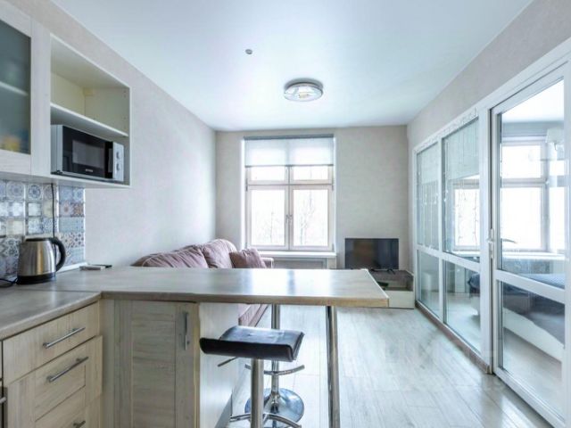 Пространство квартиры тщательно разделено на функциональные зоны — зона отдыха , уютная спальная зона с двуспальной кроватью и нишей для хранения. Можно расположить диван и создать место для комфортного просмотра ТВ.