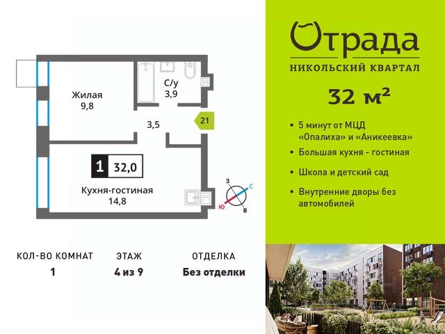 Арт. 106775706 !!!ДОМ СДАН!!! Ключи - получены. Продается 1-комнатная квартира от застройщика в ЖК "Никольский квартал Отрада" на 3 этаже. Общая площадь: 32.9 кв.м., жилая: 9.7 кв.м. Квартал расположен в удачной локации, которая сочетает благоприятную экологическую обстановку с прекрасной транспортной доступностью. До МЦД "Опалиха" и "Аникеевка" можно будет добраться на автомобиле всего за 4-5 минут. Проектом предусмотрены 14 корпусов средней этажности 6-9 этажей, а также муниципальная школа, один муниципальный и один частный детский сад, два наземных многоуровневых паркинга с кладовыми помещениями. Проект отличает узнаваемый авторский архитектурный стиль Кварталов Отрада. Современная европейская архитектура с элементами скандинавского стиля создает ощущение жизни в спокойном и безопасном благополучном районе. Отдельное преимущество естественная закрытость проекта. Территория не огорожена, но изолирована за счет естественного барьера окружающего квартал лесного массива. Такое расположение создает ощущение безопасного загородного пригорода. Кроме того, лес помогает создать особый микроклимат, защищая от городского смога. Звоните последние квартиры в этом корпусе!!!