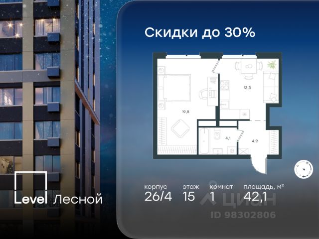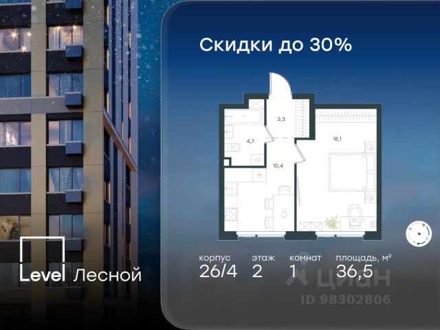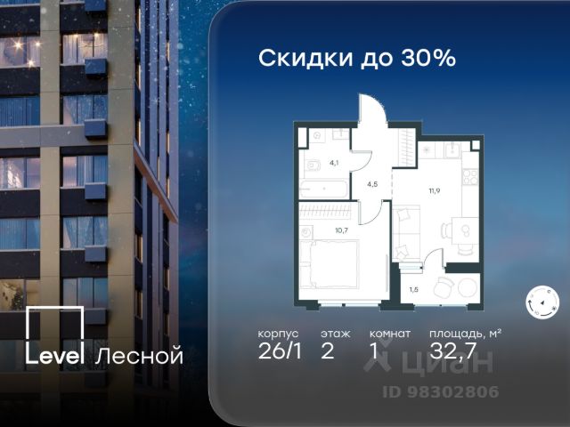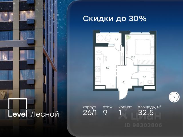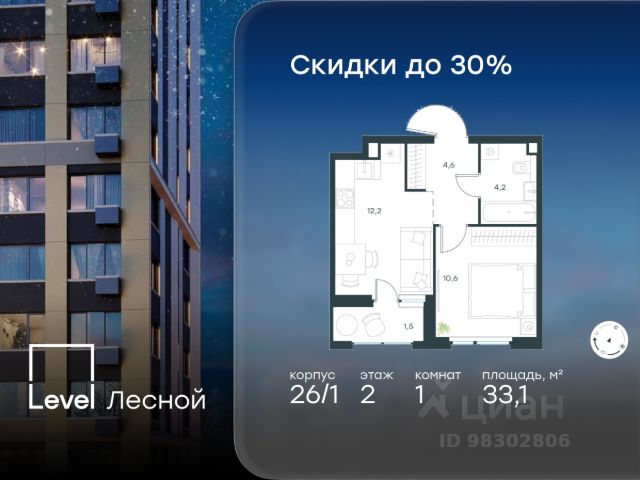 Цена указана с учётом скидки при 100%-й оплате, несубсидированной ипотеке, рассрочке (кроме программы "Рассрочка 0%"). В районе, утопающем в густой зелени лесов, многочисленных парков и скверов, продаётся 1-комнатная квартира площадью 33.00 кв.м с отделкой white box. Квартира расположена на 9 этаже в жилом комплексе комфорт-класса Level Лесной (компания Level Group/Левел групп). Отличная транспортная доступность: - 25 мин. пешком до станции метро "Пятницкое шоссе"; - 28 мин. на автобусе до станции метро и МЦД-2 "Волоколамская"; - 11 мин. на авто до МКАД; - 25 мин. на авто до ТТК. Продуманный архитектурный проект: - Концепция проекта Level Лесной от бюро СПИЧ; - Высотность комплекса до 15 этажей с уникальными видами на лесные массивы и город; - Высота потолков до 3 м; - Современные окна высотой до 1,6 м, в части квартир предусмотрены окна в пол. Высота подоконников 0,6 м; Расположение: Level Лесной строится в зелёной зоне ближайшего Подмосковья, г.о. Красногорск в посёлке Отрадное. Шаговая и автомобильная доступность до метро и больших транспортных артерий города. За 25 минут вы дойдёте до станции метро "Пятницкое шоссе", а за 20 минут на машине сможете доехать до станции метро "Тушинская". Район окружен роскошной зеленью лесов и парковых зон, занимающих территорию свыше 1 000 гектаров. Помимо благоприятной экологии, здесь множество возможностей для активного отдыха и поддержания физической формы. Облагороженная территории с полностью развитой инфраструктурой. На территории проекта находится детский сад и школа "Светлые Горы", которая входит в список лучших частных школ от Forbes Education (по данным на 2023г.). Кроме того, в пешей доступности расположено ещё 8 детских садов, а также запланировано открытие современной муниципальной школы. В непосредственной близости находятся сетевые супермаркеты и локальные магазины, аптеки, клиники, почта, библиотека, салоны красоты, рестораны, спортивные и творческие секции, развивающие детские центры. В 12 минутах пешком расположен торговый парк "Отрада" с продуктовым и строительным гипермаркетами, магазинами, кинотеатром и развлечениями для детей. Внутренняя инфраструктура: Мы знаем, как важно, чтобы магазины и сервисы были всегда рядом. В сданных корпусах Level Лесной уже расположена полностью готовая развитая инфраструктура. На первых этажах корпуса 27 предусмотрено ещё 14 коммерческих помещений. Благоустройство: Продуманное пространство и аура приватного европейского городка рождают чувство лёгкости и расслабления у каждого, кто попадает на территорию проекта. Концепцию общественных площадок разработали в партнёрстве два архитектурных бюро: Highlight Architecture и SCAPE. В безопасных дворах без машин каждый обязательно найдёт себе место для вдохновения, отдыха и спорта.