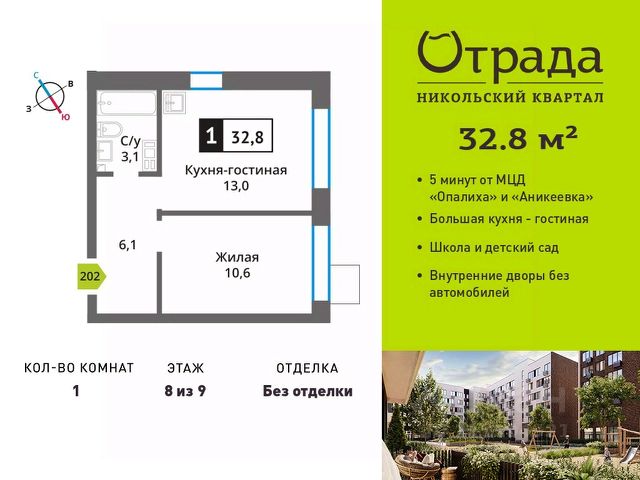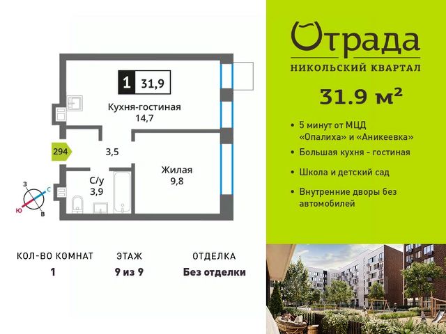 Однокомнатная квартира (евродвушка) с просторной кухней-гостиной Однокомнатная квартира (евродвушка) с просторной кухней-гостиной в жилом комплексе комфорт-класса "Никольский квартал Отрада". Планировка выполнена по современным стандартам и отличается повышенным комфортом. Квартал расположен в удачной локации, которая сочетает благоприятную экологическую обстановку с прекрасной транспортной доступностью. Проектом предусмотрены 14 корпусов высотой 6-9 этажей, а также муниципальная школа, один муниципальный и один частный детский сад, два наземных многоуровневых паркинга с кладовыми помещениями. Надежный застройщик ГК "Отрада" с высочайшим рейтингом 5 звезд от портала ЕРЗ. Все корпуса во всех ЖК сданы раньше срока!