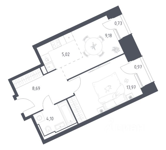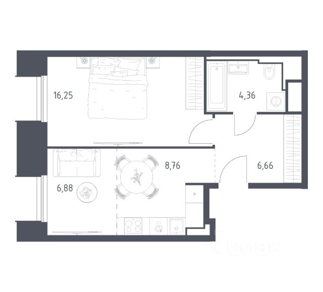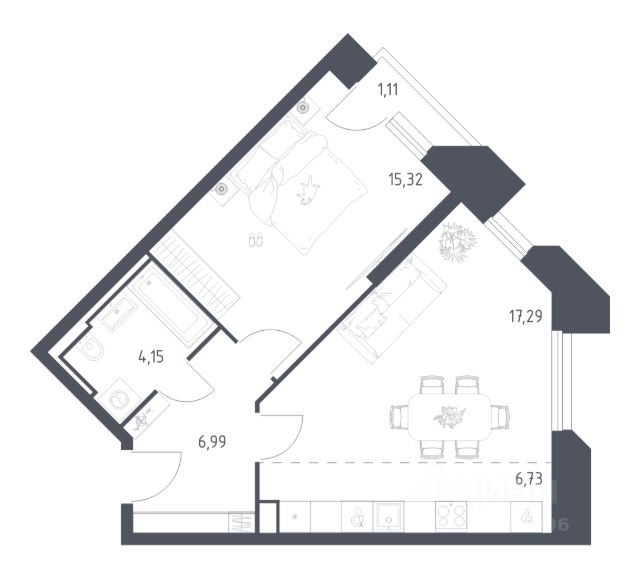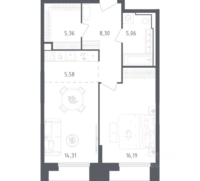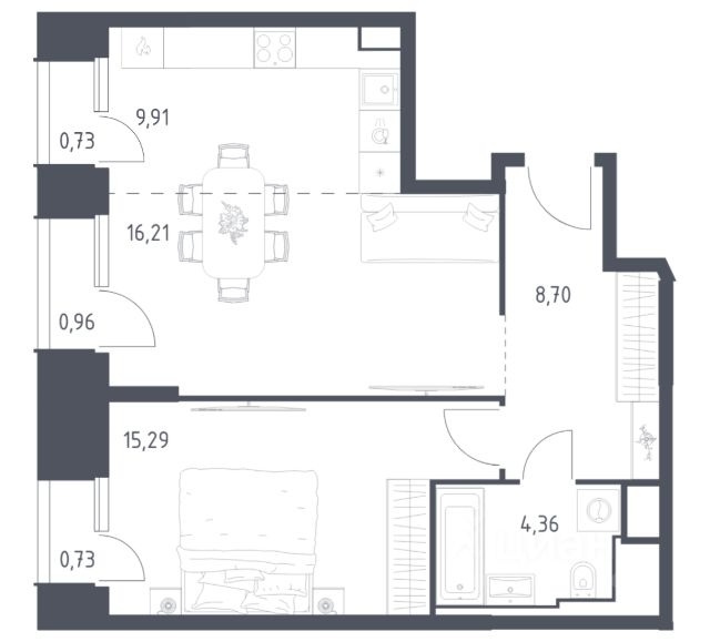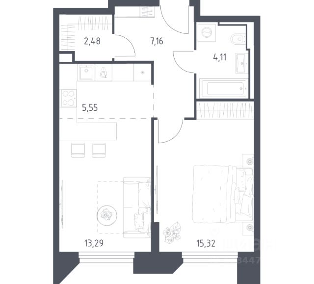 Апартамент зонирован на 2 комнаты