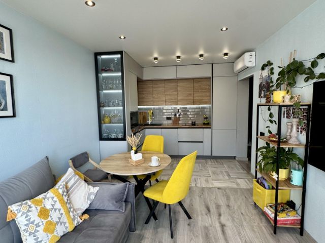 Особенности: Кухня-гостиная с барной стойкой, изолированная спальня, гардеробная, санузел в плитке до потолка с зеркалом с лэд-подсветкой.