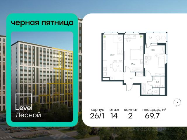 Цена указана с учётом скидки при 100%-й оплате, несубсидированной ипотеке, рассрочке (кроме программы "Рассрочка 0%"). Субсидированная семейная ипотека. Полная стоимость кредита 20,963 - 23,237% годовых. Ставка 3,9% годовых. Первоначальный взнос от 20,01%. Сумма кредита до 12 млн. руб. В районе, утопающем в густой зелени лесов, многочисленных парков и скверов, продаётся 2-комнатная квартира площадью 61.70 кв.м с отделкой white box. Квартира расположена на 14 этаже в жилом комплексе комфорт-класса Level Лесной (компания Level Group/Левел групп). Отличная транспортная доступность: - 25 мин. пешком до станции метро "Пятницкое шоссе"; - 28 мин. на автобусе до станции метро и МЦД-2 "Волоколамская"; - 11 мин. на авто до МКАД; - 25 мин. на авто до ТТК. Продуманный архитектурный проект: - Концепция проекта Level Лесной от бюро СПИЧ; - Высотность комплекса до 15 этажей с уникальными видами на лесные массивы и город; - Высота потолков до 3 м; - Современные окна высотой до 1,6 м, в части квартир предусмотрены окна в пол. Высота подоконников 0,6 м; Расположение: Level Лесной строится в зелёной зоне ближайшего Подмосковья, г.о. Красногорск в посёлке Отрадное. Шаговая и автомобильная доступность до метро и больших транспортных артерий города. За 25 минут вы дойдёте до станции метро "Пятницкое шоссе", а за 20 минут на машине сможете доехать до станции метро "Тушинская". Район окружен роскошной зеленью лесов и парковых зон, занимающих территорию свыше 1 000 гектаров. Помимо благоприятной экологии, здесь множество возможностей для активного отдыха и поддержания физической формы. Облагороженная территории с полностью развитой инфраструктурой. На территории проекта находится детский сад и школа "Светлые Горы", которая входит в список лучших частных школ от Forbes Education (по данным на 2023г.). Кроме того, в пешей доступности расположено ещё 8 детских садов, а также запланировано открытие современной муниципальной школы. В непосредственной близости находятся сетевые супермаркеты и локальные магазины, аптеки, клиники, почта, библиотека, салоны красоты, рестораны, спортивные и творческие секции, развивающие детские центры. В 12 минутах пешком расположен торговый парк "Отрада" с продуктовым и строительным гипермаркетами, магазинами, кинотеатром и развлечениями для детей. Внутренняя инфраструктура: Мы знаем, как важно, чтобы магазины и сервисы были всегда рядом. В сданных корпусах Level Лесной уже расположена полностью готовая развитая инфраструктура. На первых этажах корпуса 27 предусмотрено ещё 14 коммерческих помещений. Благоустройство: Продуманное пространство и аура приватного европейского городка рождают чувство лёгкости и расслабления у каждого, кто попадает на территорию проекта. Концепцию общественных площадок разработали в партнёрстве два архитектурных бюро: Highlight Architecture и SCAPE. В безопасных дворах без машин каждый обязательно найдёт себе место для вдохновения, отдыха и спорта.