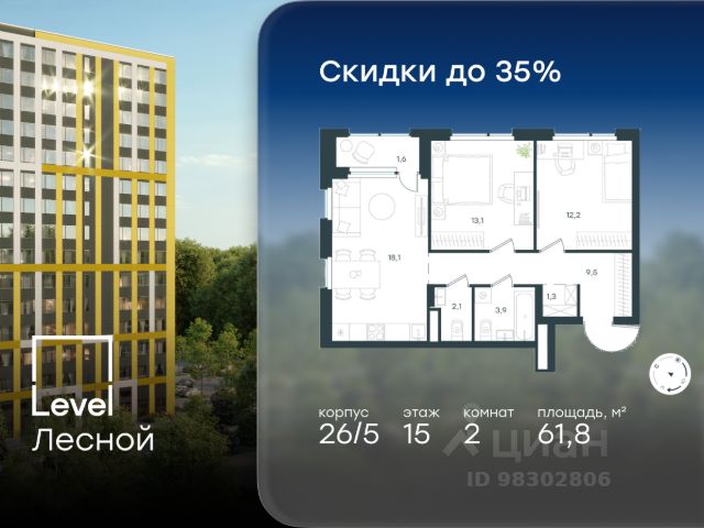 Цена указана с учётом скидки при 100%-й оплате, несубсидированной ипотеке, рассрочке (кроме программы "Рассрочка 0%"). В районе, утопающем в густой зелени лесов, многочисленных парков и скверов, продаётся 2-комнатная квартира площадью 56.40 кв.м с отделкой white box. Квартира расположена на 15 этаже в жилом комплексе комфорт-класса Level Лесной (компания Level Group/Левел групп). Отличная транспортная доступность: - 25 мин. пешком до станции метро "Пятницкое шоссе"; - 28 мин. на автобусе до станции метро и МЦД-2 "Волоколамская"; - 11 мин. на авто до МКАД; - 25 мин. на авто до ТТК. Продуманный архитектурный проект: - Концепция проекта Level Лесной от бюро СПИЧ; - Высотность комплекса до 15 этажей с уникальными видами на лесные массивы и город; - Высота потолков до 3 м; - Современные окна высотой до 1,6 м, в части квартир предусмотрены окна в пол. Высота подоконников 0,6 м; Расположение: Level Лесной строится в зелёной зоне ближайшего Подмосковья, г.о. Красногорск в посёлке Отрадное. Шаговая и автомобильная доступность до метро и больших транспортных артерий города. За 25 минут вы дойдёте до станции метро "Пятницкое шоссе", а за 20 минут на машине сможете доехать до станции метро "Тушинская". Район окружен роскошной зеленью лесов и парковых зон, занимающих территорию свыше 1 000 гектаров. Помимо благоприятной экологии, здесь множество возможностей для активного отдыха и поддержания физической формы. Облагороженная территории с полностью развитой инфраструктурой. На территории проекта находится детский сад и школа "Светлые Горы", которая входит в список лучших частных школ от Forbes Education (по данным на 2023г.). Кроме того, в пешей доступности расположено ещё 8 детских садов, а также запланировано открытие современной муниципальной школы. В непосредственной близости находятся сетевые супермаркеты и локальные магазины, аптеки, клиники, почта, библиотека, салоны красоты, рестораны, спортивные и творческие секции, развивающие детские центры. В 12 минутах пешком расположен торговый парк "Отрада" с продуктовым и строительным гипермаркетами, магазинами, кинотеатром и развлечениями для детей. Внутренняя инфраструктура: Мы знаем, как важно, чтобы магазины и сервисы были всегда рядом. В сданных корпусах Level Лесной уже расположена полностью готовая развитая инфраструктура. На первых этажах корпуса 27 предусмотрено ещё 14 коммерческих помещений. Благоустройство: Продуманное пространство и аура приватного европейского городка рождают чувство лёгкости и расслабления у каждого, кто попадает на территорию проекта. Концепцию общественных площадок разработали в партнёрстве два архитектурных бюро: Highlight Architecture и SCAPE. В безопасных дворах без машин каждый обязательно найдёт себе место для вдохновения, отдыха и спорта.
