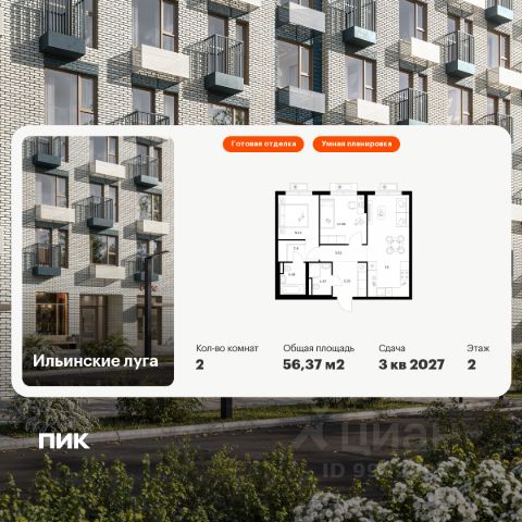 Продаётся 2-комн. квартира площадью 54,2 кв.м на 2 этаже 9 этажного дома (Корпус 3.3, Секция 1) проекта ПИК Ильинские луга. Светлый просторный подъезд на уровне земли, функциональная планировка, большие окна, c отделкой. Жилой район "Ильинские луга" находится в 10 километрах от МКАД по Новорижскому шоссе, в 20 минутах на автомобиле от станций метро "Волоколамская", "Тушинская" и "Строгино". В будущем ближе к проекту, в 9 минутах пути на машине, откроется станция "Ильинская" Рублёво-Архангельской линии, которая будет соединять Арбатско-Покровскую линию и Большую кольцевую линию. Сейчас в квартале начались продажи в корпусах 3.2, 3.3, 3.4, 3.5 и 3.6. "Ильинские луга" — масштабный проект, в который входит девять детских садов, четыре школы и поликлиника. Он строится в престижном и экологичном районе среди лесов и памятников природы. За 5 минут от жилого квартала можно доехать до Рублёво-Успенского шоссе, а за 30 минут — до центра Москвы. До крупного торгового центра "РИГАМОЛЛ" всего 5 минут на автомобиле, а до ТЦ "Твой дом" и гипермаркета "Глобус" — 10 минут. В "Ильинских лугах" строятся только девятиэтажные дома — такая архитектура соответствует спокойной жизни за городом. В каждом дворе-парке есть места для отдыха, детские и спортивные площадки. А ещё, здесь уже открыт большой PlayHub "Гравити" — современное игровое пространство с космической тематикой, холмами, зонами для игр и отдыха жителей любого возраста. На первых этажах уже работают магазины, кафе и пекарни. Места для отдыха от "Ильинских лугов" тоже недалеко: 10 минут на машине — и вы в музее-усадьбе "Архангельское". Также рядом находится Лохин остров — памятник природы, где водятся речные черепахи, есть места для кемпинга и возможность сплавиться по реке. Артикул 993871 (Застройщик ООО "СЗ "ГРАДОЛИМП")