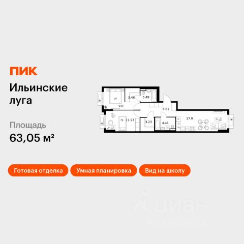 Продаётся 2-комн. квартира площадью 49,87 кв.м на 2 этаже 9 этажного дома (Корпус 4.2, Секция 4) проекта ПИК Ильинские луга. Светлый просторный подъезд на уровне земли, функциональная планировка, большие окна, предчистовая отделка. Жилой район "Ильинские луга" находится в 10 километрах от МКАД по Новорижскому шоссе, в 20 минутах на автомобиле от станций метро "Волоколамская", "Тушинская" и "Строгино". В будущем ближе к проекту, в 9 минутах пути на машине, откроется станция "Ильинская" Рублёво-Архангельской линии, которая будет соединять Арбатско-Покровскую линию и Большую кольцевую линию. Сейчас в квартале начались продажи в корпусах 3.2, 3.3, 3.4, 3.5 и 3.6. "Ильинские луга" — масштабный проект, в который входит девять детских садов, четыре школы и поликлиника. Он строится в престижном и экологичном районе среди лесов и памятников природы. За 5 минут от жилого квартала можно доехать до Рублёво-Успенского шоссе, а за 30 минут — до центра Москвы. До крупного торгового центра "РИГАМОЛЛ" всего 5 минут на автомобиле, а до ТЦ "Твой дом" и гипермаркета "Глобус" — 10 минут. В "Ильинских лугах" строятся только девятиэтажные дома — такая архитектура соответствует спокойной жизни за городом. В каждом дворе-парке есть места для отдыха, детские и спортивные площадки. А ещё, здесь уже открыт большой PlayHub "Гравити" — современное игровое пространство с космической тематикой, холмами, зонами для игр и отдыха жителей любого возраста. На первых этажах уже работают магазины, кафе и пекарни. Места для отдыха от "Ильинских лугов" тоже недалеко: 10 минут на машине — и вы в музее-усадьбе "Архангельское". Также рядом находится Лохин остров — памятник природы, где водятся речные черепахи, есть места для кемпинга и возможность сплавиться по реке. Артикул 1015543 (Застройщик ООО "СЗ "ГРАДОЛИМП")