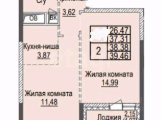 Расположена на 15-м этаже 23-этажного монолитного дома общей площадью - 37,3 м².