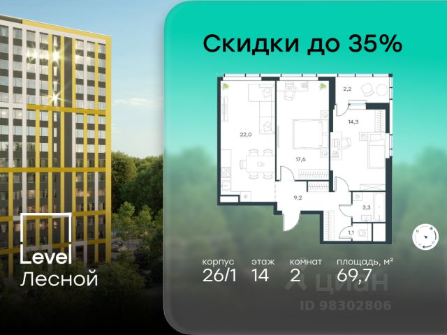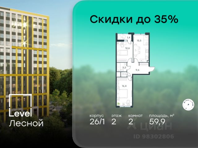 Цена указана с учётом скидки при 100%-й оплате, несубсидированной ипотеке, рассрочке (кроме программы "Рассрочка 0%"). В районе, утопающем в густой зелени лесов, многочисленных парков и скверов, продаётся 2-комнатная квартира площадью 61.40 кв.м с отделкой white box. Квартира расположена на 2 этаже в жилом комплексе комфорт-класса Level Лесной (компания Level Group/Левел групп). Отличная транспортная доступность: - 25 мин. пешком до станции метро "Пятницкое шоссе"; - 28 мин. на автобусе до станции метро и МЦД-2 "Волоколамская"; - 11 мин. на авто до МКАД; - 25 мин. на авто до ТТК. Продуманный архитектурный проект: - Концепция проекта Level Лесной от бюро СПИЧ; - Высотность комплекса до 15 этажей с уникальными видами на лесные массивы и город; - Высота потолков до 3 м; - Современные окна высотой до 1,6 м, в части квартир предусмотрены окна в пол. Высота подоконников 0,6 м; Расположение: Level Лесной строится в зелёной зоне ближайшего Подмосковья, г.о. Красногорск в посёлке Отрадное. Шаговая и автомобильная доступность до метро и больших транспортных артерий города. За 25 минут вы дойдёте до станции метро "Пятницкое шоссе", а за 20 минут на машине сможете доехать до станции метро "Тушинская". Район окружен роскошной зеленью лесов и парковых зон, занимающих территорию свыше 1 000 гектаров. Помимо благоприятной экологии, здесь множество возможностей для активного отдыха и поддержания физической формы. Облагороженная территории с полностью развитой инфраструктурой. На территории проекта находится детский сад и школа "Светлые Горы", которая входит в список лучших частных школ от Forbes Education (по данным на 2023г.). Кроме того, в пешей доступности расположено ещё 8 детских садов, а также запланировано открытие современной муниципальной школы. В непосредственной близости находятся сетевые супермаркеты и локальные магазины, аптеки, клиники, почта, библиотека, салоны красоты, рестораны, спортивные и творческие секции, развивающие детские центры. В 12 минутах пешком расположен торговый парк "Отрада" с продуктовым и строительным гипермаркетами, магазинами, кинотеатром и развлечениями для детей. Внутренняя инфраструктура: Мы знаем, как важно, чтобы магазины и сервисы были всегда рядом. В сданных корпусах Level Лесной уже расположена полностью готовая развитая инфраструктура. На первых этажах корпуса 27 предусмотрено ещё 14 коммерческих помещений. Благоустройство: Продуманное пространство и аура приватного европейского городка рождают чувство лёгкости и расслабления у каждого, кто попадает на территорию проекта. Концепцию общественных площадок разработали в партнёрстве два архитектурных бюро: Highlight Architecture и SCAPE. В безопасных дворах без машин каждый обязательно найдёт себе место для вдохновения, отдыха и спорта.