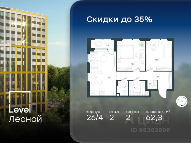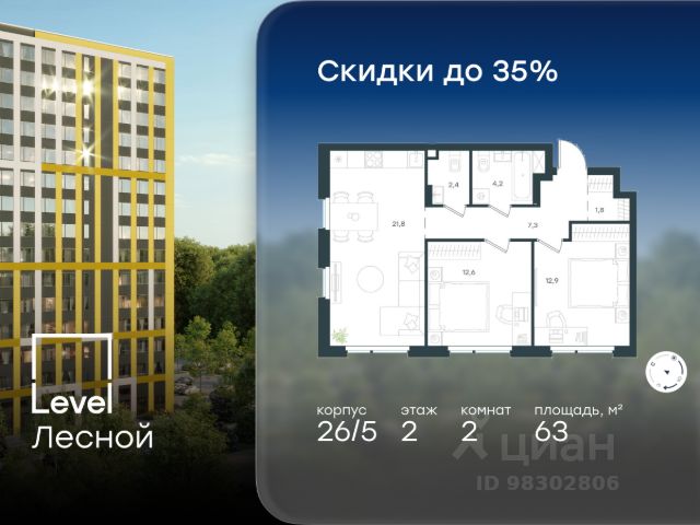 Цена указана с учётом скидки при 100%-й оплате, несубсидированной ипотеке, рассрочке (кроме программы "Рассрочка 0%"). В районе, утопающем в густой зелени лесов, многочисленных парков и скверов, продаётся 2-комнатная квартира площадью 61.40 кв.м с отделкой white box. Квартира расположена на 2 этаже в жилом комплексе комфорт-класса Level Лесной (компания Level Group/Левел групп). Отличная транспортная доступность: - 25 мин. пешком до станции метро "Пятницкое шоссе"; - 28 мин. на автобусе до станции метро и МЦД-2 "Волоколамская"; - 11 мин. на авто до МКАД; - 25 мин. на авто до ТТК. Продуманный архитектурный проект: - Концепция проекта Level Лесной от бюро СПИЧ; - Высотность комплекса до 15 этажей с уникальными видами на лесные массивы и город; - Высота потолков до 3 м; - Современные окна высотой до 1,6 м, в части квартир предусмотрены окна в пол. Высота подоконников 0,6 м; Расположение: Level Лесной строится в зелёной зоне ближайшего Подмосковья, г.о. Красногорск в посёлке Отрадное. Шаговая и автомобильная доступность до метро и больших транспортных артерий города. За 25 минут вы дойдёте до станции метро "Пятницкое шоссе", а за 20 минут на машине сможете доехать до станции метро "Тушинская". Район окружен роскошной зеленью лесов и парковых зон, занимающих территорию свыше 1 000 гектаров. Помимо благоприятной экологии, здесь множество возможностей для активного отдыха и поддержания физической формы. Облагороженная территории с полностью развитой инфраструктурой. На территории проекта находится детский сад и школа "Светлые Горы", которая входит в список лучших частных школ от Forbes Education (по данным на 2023г.). Кроме того, в пешей доступности расположено ещё 8 детских садов, а также запланировано открытие современной муниципальной школы. В непосредственной близости находятся сетевые супермаркеты и локальные магазины, аптеки, клиники, почта, библиотека, салоны красоты, рестораны, спортивные и творческие секции, развивающие детские центры. В 12 минутах пешком расположен торговый парк "Отрада" с продуктовым и строительным гипермаркетами, магазинами, кинотеатром и развлечениями для детей. Внутренняя инфраструктура: Мы знаем, как важно, чтобы магазины и сервисы были всегда рядом. В сданных корпусах Level Лесной уже расположена полностью готовая развитая инфраструктура. На первых этажах корпуса 27 предусмотрено ещё 14 коммерческих помещений. Благоустройство: Продуманное пространство и аура приватного европейского городка рождают чувство лёгкости и расслабления у каждого, кто попадает на территорию проекта. Концепцию общественных площадок разработали в партнёрстве два архитектурных бюро: Highlight Architecture и SCAPE. В безопасных дворах без машин каждый обязательно найдёт себе место для вдохновения, отдыха и спорта.
