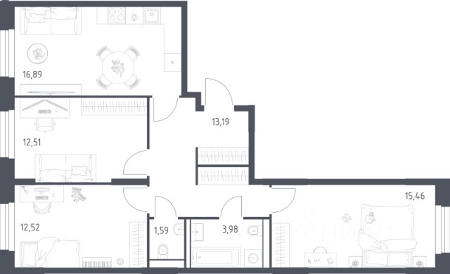 Продаётся 3-комнатная квартира 861, площадью 64,91 м², на 12 этаже в ЖК "Ильинойс" корпус 3. Стоимость — от 15738321 руб. Квартира без отделки, планировка распашная, окна во двор.