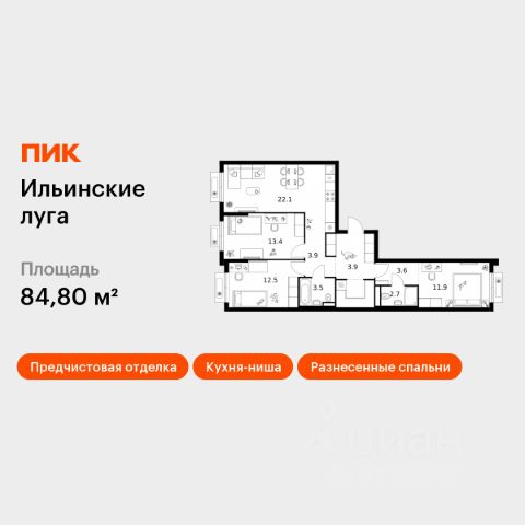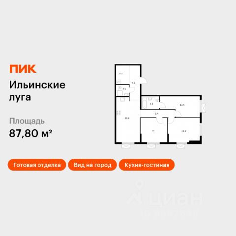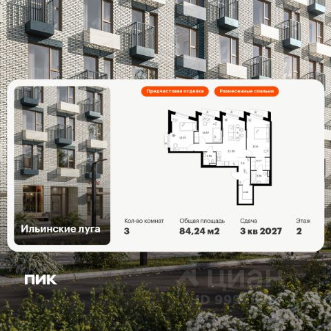 Продаётся 3-комн. квартира площадью 69,2 кв.м на 2 этаже 9 этажного дома (Корпус 4.3, Секция 4) проекта ПИК Ильинские луга. Светлый просторный подъезд на уровне земли, функциональная планировка, большие окна, предчистовая отделка. Жилой район "Ильинские луга" находится в 10 километрах от МКАД по Новорижскому шоссе, в 20 минутах на автомобиле от станций метро "Волоколамская", "Тушинская" и "Строгино". В будущем ближе к проекту, в 9 минутах пути на машине, откроется станция "Ильинская" Рублёво-Архангельской линии, которая будет соединять Арбатско-Покровскую линию и Большую кольцевую линию. Сейчас в квартале начались продажи в корпусах 3.2, 3.3, 3.4, 3.5 и 3.6. "Ильинские луга" — масштабный проект, в который входит девять детских садов, четыре школы и поликлиника. Он строится в престижном и экологичном районе среди лесов и памятников природы. За 5 минут от жилого квартала можно доехать до Рублёво-Успенского шоссе, а за 30 минут — до центра Москвы. До крупного торгового центра "РИГАМОЛЛ" всего 5 минут на автомобиле, а до ТЦ "Твой дом" и гипермаркета "Глобус" — 10 минут. В "Ильинских лугах" строятся только девятиэтажные дома — такая архитектура соответствует спокойной жизни за городом. В каждом дворе-парке есть места для отдыха, детские и спортивные площадки. А ещё, здесь уже открыт большой PlayHub "Гравити" — современное игровое пространство с космической тематикой, холмами, зонами для игр и отдыха жителей любого возраста. На первых этажах уже работают магазины, кафе и пекарни. Места для отдыха от "Ильинских лугов" тоже недалеко: 10 минут на машине — и вы в музее-усадьбе "Архангельское". Также рядом находится Лохин остров — памятник природы, где водятся речные черепахи, есть места для кемпинга и возможность сплавиться по реке. Артикул 1012094 (Застройщик ООО "СЗ "ГРАДОЛИМП")