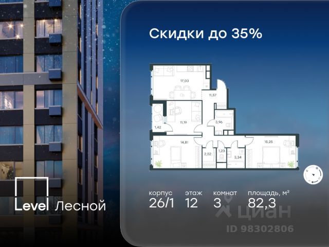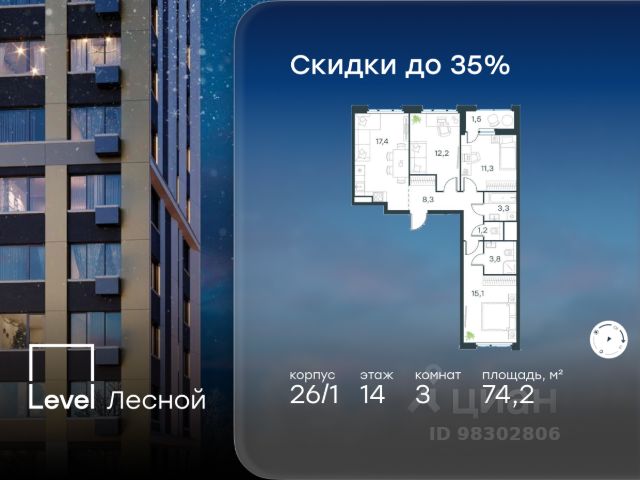 Цена указана с учётом скидки при 100%-й оплате, несубсидированной ипотеке, рассрочке (кроме программы "Рассрочка 0%"). В районе, утопающем в густой зелени лесов, многочисленных парков и скверов, продаётся 3-комнатная квартира площадью 88.10 кв.м без отделки. Квартира расположена на 12 этаже в жилом комплексе комфорт-класса Level Лесной (компания Level Group/Левел групп). Отличная транспортная доступность: - 25 мин. пешком до станции метро "Пятницкое шоссе"; - 28 мин. на автобусе до станции метро и МЦД-2 "Волоколамская"; - 11 мин. на авто до МКАД; - 25 мин. на авто до ТТК. Продуманный архитектурный проект: - Концепция проекта Level Лесной от бюро СПИЧ; - Высотность комплекса до 15 этажей с уникальными видами на лесные массивы и город; - Высота потолков до 3 м; - Современные окна высотой до 1,6 м, в части квартир предусмотрены окна в пол. Высота подоконников 0,6 м; Расположение: Level Лесной строится в зелёной зоне ближайшего Подмосковья, г.о. Красногорск в посёлке Отрадное. Шаговая и автомобильная доступность до метро и больших транспортных артерий города. За 25 минут вы дойдёте до станции метро "Пятницкое шоссе", а за 20 минут на машине сможете доехать до станции метро "Тушинская". Район окружен роскошной зеленью лесов и парковых зон, занимающих территорию свыше 1 000 гектаров. Помимо благоприятной экологии, здесь множество возможностей для активного отдыха и поддержания физической формы. Облагороженная территории с полностью развитой инфраструктурой. На территории проекта находится детский сад и школа "Светлые Горы", которая входит в список лучших частных школ от Forbes Education (по данным на 2023г.). Кроме того, в пешей доступности расположено ещё 8 детских садов, а также запланировано открытие современной муниципальной школы. В непосредственной близости находятся сетевые супермаркеты и локальные магазины, аптеки, клиники, почта, библиотека, салоны красоты, рестораны, спортивные и творческие секции, развивающие детские центры. В 12 минутах пешком расположен торговый парк "Отрада" с продуктовым и строительным гипермаркетами, магазинами, кинотеатром и развлечениями для детей. Внутренняя инфраструктура: Мы знаем, как важно, чтобы магазины и сервисы были всегда рядом. В сданных корпусах Level Лесной уже расположена полностью готовая развитая инфраструктура. На первых этажах корпуса 27 предусмотрено ещё 14 коммерческих помещений. Благоустройство: Продуманное пространство и аура приватного европейского городка рождают чувство лёгкости и расслабления у каждого, кто попадает на территорию проекта. Концепцию общественных площадок разработали в партнёрстве два архитектурных бюро: Highlight Architecture и SCAPE. В безопасных дворах без машин каждый обязательно найдёт себе место для вдохновения, отдыха и спорта.