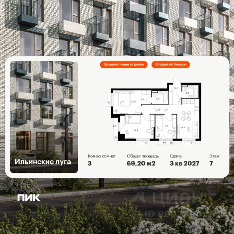 Продаётся 3-комн. квартира площадью 69,2 кв.м на 7 этаже 9 этажного дома (Корпус 4.3, Секция 4) проекта ПИК Ильинские луга. Светлый просторный подъезд на уровне земли, функциональная планировка, большие окна, предчистовая отделка. Жилой район "Ильинские луга" находится в 10 километрах от МКАД по Новорижскому шоссе, в 20 минутах на автомобиле от станций метро "Волоколамская", "Тушинская" и "Строгино". В будущем ближе к проекту, в 9 минутах пути на машине, откроется станция "Ильинская" Рублёво-Архангельской линии, которая будет соединять Арбатско-Покровскую линию и Большую кольцевую линию. Сейчас в квартале начались продажи в корпусах 3.2, 3.3, 3.4, 3.5 и 3.6. "Ильинские луга" — масштабный проект, в который входит девять детских садов, четыре школы и поликлиника. Он строится в престижном и экологичном районе среди лесов и памятников природы. За 5 минут от жилого квартала можно доехать до Рублёво-Успенского шоссе, а за 30 минут — до центра Москвы. До крупного торгового центра "РИГАМОЛЛ" всего 5 минут на автомобиле, а до ТЦ "Твой дом" и гипермаркета "Глобус" — 10 минут. В "Ильинских лугах" строятся только девятиэтажные дома — такая архитектура соответствует спокойной жизни за городом. В каждом дворе-парке есть места для отдыха, детские и спортивные площадки. А ещё, здесь уже открыт большой PlayHub "Гравити" — современное игровое пространство с космической тематикой, холмами, зонами для игр и отдыха жителей любого возраста. На первых этажах уже работают магазины, кафе и пекарни. Места для отдыха от "Ильинских лугов" тоже недалеко: 10 минут на машине — и вы в музее-усадьбе "Архангельское". Также рядом находится Лохин остров — памятник природы, где водятся речные черепахи, есть места для кемпинга и возможность сплавиться по реке. Артикул 1012164 (Застройщик ООО "СЗ "ГРАДОЛИМП") 3-комнатная квартира первичка в поселке Ильинское-Усово Московской области.