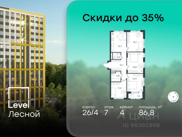 Цена указана с учётом скидки при 100%-й оплате, несубсидированной ипотеке, рассрочке (кроме программы "Рассрочка 0%"). В районе, утопающем в густой зелени лесов, многочисленных парков и скверов, продаётся 4-комнатная квартира площадью 86.80 кв.м с отделкой white box. Квартира расположена на 7 этаже в жилом комплексе комфорт-класса Level Лесной (компания Level Group/Левел групп). Отличная транспортная доступность: - 25 мин. пешком до станции метро "Пятницкое шоссе"; - 28 мин. на автобусе до станции метро и МЦД-2 "Волоколамская"; - 11 мин. на авто до МКАД; - 25 мин. на авто до ТТК. Продуманный архитектурный проект: - Концепция проекта Level Лесной от бюро СПИЧ; - Высотность комплекса до 15 этажей с уникальными видами на лесные массивы и город; - Высота потолков до 3 м; - Современные окна высотой до 1,6 м, в части квартир предусмотрены окна в пол. Высота подоконников 0,6 м; Расположение: Level Лесной строится в зелёной зоне ближайшего Подмосковья, г.о. Красногорск в посёлке Отрадное. Шаговая и автомобильная доступность до метро и больших транспортных артерий города. За 25 минут вы дойдёте до станции метро "Пятницкое шоссе", а за 20 минут на машине сможете доехать до станции метро "Тушинская". Район окружен роскошной зеленью лесов и парковых зон, занимающих территорию свыше 1 000 гектаров. Помимо благоприятной экологии, здесь множество возможностей для активного отдыха и поддержания физической формы. Облагороженная территории с полностью развитой инфраструктурой. На территории проекта находится детский сад и школа "Светлые Горы", которая входит в список лучших частных школ от Forbes Education (по данным на 2023г.). Кроме того, в пешей доступности расположено ещё 8 детских садов, а также запланировано открытие современной муниципальной школы. В непосредственной близости находятся сетевые супермаркеты и локальные магазины, аптеки, клиники, почта, библиотека, салоны красоты, рестораны, спортивные и творческие секции, развивающие детские центры. В 12 минутах пешком расположен торговый парк "Отрада" с продуктовым и строительным гипермаркетами, магазинами, кинотеатром и развлечениями для детей. Внутренняя инфраструктура: Мы знаем, как важно, чтобы магазины и сервисы были всегда рядом. В сданных корпусах Level Лесной уже расположена полностью готовая развитая инфраструктура. На первых этажах корпуса 27 предусмотрено ещё 14 коммерческих помещений. Благоустройство: Продуманное пространство и аура приватного европейского городка рождают чувство лёгкости и расслабления у каждого, кто попадает на территорию проекта. Концепцию общественных площадок разработали в партнёрстве два архитектурных бюро: Highlight Architecture и SCAPE. В безопасных дворах без машин каждый обязательно найдёт себе место для вдохновения, отдыха и спорта.