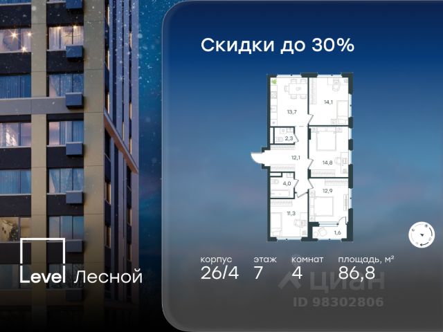 Цена указана с учётом скидки при 100%-й оплате, несубсидированной ипотеке, рассрочке (кроме программы "Рассрочка 0%"). В районе, утопающем в густой зелени лесов, многочисленных парков и скверов, продаётся 4-комнатная квартира площадью 93.00 кв.м с отделкой white box. Квартира расположена на 7 этаже в жилом комплексе комфорт-класса Level Лесной (компания Level Group/Левел групп). Отличная транспортная доступность: - 25 мин. пешком до станции метро "Пятницкое шоссе"; - 28 мин. на автобусе до станции метро и МЦД-2 "Волоколамская"; - 11 мин. на авто до МКАД; - 25 мин. на авто до ТТК. Продуманный архитектурный проект: - Концепция проекта Level Лесной от бюро СПИЧ; - Высотность комплекса до 15 этажей с уникальными видами на лесные массивы и город; - Высота потолков до 3 м; - Современные окна высотой до 1,6 м, в части квартир предусмотрены окна в пол. Высота подоконников 0,6 м; Расположение: Level Лесной строится в зелёной зоне ближайшего Подмосковья, г.о. Красногорск в посёлке Отрадное. Шаговая и автомобильная доступность до метро и больших транспортных артерий города. За 25 минут вы дойдёте до станции метро "Пятницкое шоссе", а за 20 минут на машине сможете доехать до станции метро "Тушинская". Район окружен роскошной зеленью лесов и парковых зон, занимающих территорию свыше 1 000 гектаров. Помимо благоприятной экологии, здесь множество возможностей для активного отдыха и поддержания физической формы. Облагороженная территории с полностью развитой инфраструктурой. На территории проекта находится детский сад и школа "Светлые Горы", которая входит в список лучших частных школ от Forbes Education (по данным на 2023г.). Кроме того, в пешей доступности расположено ещё 8 детских садов, а также запланировано открытие современной муниципальной школы. В непосредственной близости находятся сетевые супермаркеты и локальные магазины, аптеки, клиники, почта, библиотека, салоны красоты, рестораны, спортивные и творческие секции, развивающие детские центры. В 12 минутах пешком расположен торговый парк "Отрада" с продуктовым и строительным гипермаркетами, магазинами, кинотеатром и развлечениями для детей. Внутренняя инфраструктура: Мы знаем, как важно, чтобы магазины и сервисы были всегда рядом. В сданных корпусах Level Лесной уже расположена полностью готовая развитая инфраструктура. На первых этажах корпуса 27 предусмотрено ещё 14 коммерческих помещений. Благоустройство: Продуманное пространство и аура приватного европейского городка рождают чувство лёгкости и расслабления у каждого, кто попадает на территорию проекта. Концепцию общественных площадок разработали в партнёрстве два архитектурных бюро: Highlight Architecture и SCAPE. В безопасных дворах без машин каждый обязательно найдёт себе место для вдохновения, отдыха и спорта.