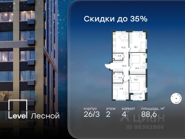 Цена указана с учётом скидки при 100%-й оплате, несубсидированной ипотеке, рассрочке (кроме программы "Рассрочка 0%"). В районе, утопающем в густой зелени лесов, многочисленных парков и скверов, продаётся 4-комнатная квартира площадью 93.00 кв.м с отделкой white box. Квартира расположена на 7 этаже в жилом комплексе комфорт-класса Level Лесной (компания Level Group/Левел групп). Отличная транспортная доступность: - 25 мин. пешком до станции метро "Пятницкое шоссе"; - 28 мин. на автобусе до станции метро и МЦД-2 "Волоколамская"; - 11 мин. на авто до МКАД; - 25 мин. на авто до ТТК. Продуманный архитектурный проект: - Концепция проекта Level Лесной от бюро СПИЧ; - Высотность комплекса до 15 этажей с уникальными видами на лесные массивы и город; - Высота потолков до 3 м; - Современные окна высотой до 1,6 м, в части квартир предусмотрены окна в пол. Высота подоконников 0,6 м; Расположение: Level Лесной строится в зелёной зоне ближайшего Подмосковья, г.о. Красногорск в посёлке Отрадное. Шаговая и автомобильная доступность до метро и больших транспортных артерий города. За 25 минут вы дойдёте до станции метро "Пятницкое шоссе", а за 20 минут на машине сможете доехать до станции метро "Тушинская". Район окружен роскошной зеленью лесов и парковых зон, занимающих территорию свыше 1 000 гектаров. Помимо благоприятной экологии, здесь множество возможностей для активного отдыха и поддержания физической формы. Облагороженная территории с полностью развитой инфраструктурой. На территории проекта находится детский сад и школа "Светлые Горы", которая входит в список лучших частных школ от Forbes Education (по данным на 2023г.). Кроме того, в пешей доступности расположено ещё 8 детских садов, а также запланировано открытие современной муниципальной школы. В непосредственной близости находятся сетевые супермаркеты и локальные магазины, аптеки, клиники, почта, библиотека, салоны красоты, рестораны, спортивные и творческие секции, развивающие детские центры. В 12 минутах пешком расположен торговый парк "Отрада" с продуктовым и строительным гипермаркетами, магазинами, кинотеатром и развлечениями для детей. Внутренняя инфраструктура: Мы знаем, как важно, чтобы магазины и сервисы были всегда рядом. В сданных корпусах Level Лесной уже расположена полностью готовая развитая инфраструктура. На первых этажах корпуса 27 предусмотрено ещё 14 коммерческих помещений. Благоустройство: Продуманное пространство и аура приватного европейского городка рождают чувство лёгкости и расслабления у каждого, кто попадает на территорию проекта. Концепцию общественных площадок разработали в партнёрстве два архитектурных бюро: Highlight Architecture и SCAPE. В безопасных дворах без машин каждый обязательно найдёт себе место для вдохновения, отдыха и спорта.