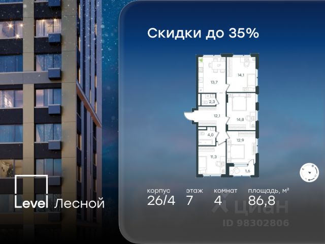 Цена указана с учётом скидки при 100%-й оплате, несубсидированной ипотеке, рассрочке (кроме программы "Рассрочка 0%"). В районе, утопающем в густой зелени лесов, многочисленных парков и скверов, продаётся 4-комнатная квартира площадью 93.00 кв.м с отделкой white box. Квартира расположена на 7 этаже в жилом комплексе комфорт-класса Level Лесной (компания Level Group/Левел групп). Отличная транспортная доступность: - 25 мин. пешком до станции метро "Пятницкое шоссе"; - 28 мин. на автобусе до станции метро и МЦД-2 "Волоколамская"; - 11 мин. на авто до МКАД; - 25 мин. на авто до ТТК. Продуманный архитектурный проект: - Концепция проекта Level Лесной от бюро СПИЧ; - Высотность комплекса до 15 этажей с уникальными видами на лесные массивы и город; - Высота потолков до 3 м; - Современные окна высотой до 1,6 м, в части квартир предусмотрены окна в пол. Высота подоконников 0,6 м; Расположение: Level Лесной строится в зелёной зоне ближайшего Подмосковья, г.о. Красногорск в посёлке Отрадное. Шаговая и автомобильная доступность до метро и больших транспортных артерий города. За 25 минут вы дойдёте до станции метро "Пятницкое шоссе", а за 20 минут на машине сможете доехать до станции метро "Тушинская". Район окружен роскошной зеленью лесов и парковых зон, занимающих территорию свыше 1 000 гектаров. Помимо благоприятной экологии, здесь множество возможностей для активного отдыха и поддержания физической формы. Облагороженная территории с полностью развитой инфраструктурой. На территории проекта находится детский сад и школа "Светлые Горы", которая входит в список лучших частных школ от Forbes Education (по данным на 2023г.). Кроме того, в пешей доступности расположено ещё 8 детских садов, а также запланировано открытие современной муниципальной школы. В непосредственной близости находятся сетевые супермаркеты и локальные магазины, аптеки, клиники, почта, библиотека, салоны красоты, рестораны, спортивные и творческие секции, развивающие детские центры. В 12 минутах пешком расположен торговый парк "Отрада" с продуктовым и строительным гипермаркетами, магазинами, кинотеатром и развлечениями для детей. Внутренняя инфраструктура: Мы знаем, как важно, чтобы магазины и сервисы были всегда рядом. В сданных корпусах Level Лесной уже расположена полностью готовая развитая инфраструктура. На первых этажах корпуса 27 предусмотрено ещё 14 коммерческих помещений. Благоустройство: Продуманное пространство и аура приватного европейского городка рождают чувство лёгкости и расслабления у каждого, кто попадает на территорию проекта. Концепцию общественных площадок разработали в партнёрстве два архитектурных бюро: Highlight Architecture и SCAPE. В безопасных дворах без машин каждый обязательно найдёт себе место для вдохновения, отдыха и спорта. Продам 4-комнатную квартиру с отделкой в городском округе Красногорске Московской области.