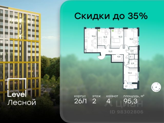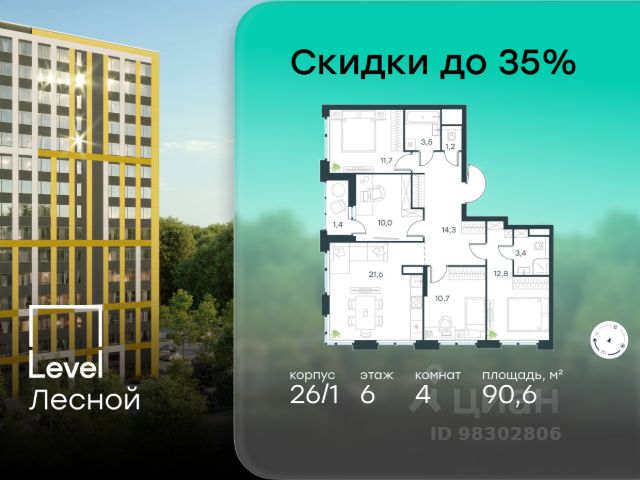 Цена указана с учётом скидки при 100%-й оплате, несубсидированной ипотеке, рассрочке (кроме программы "Рассрочка 0%"). В районе, утопающем в густой зелени лесов, многочисленных парков и скверов, продаётся 4-комнатная квартира площадью 97.80 кв.м с отделкой white box. Квартира расположена на 6 этаже в жилом комплексе комфорт-класса Level Лесной (компания Level Group/Левел групп). Отличная транспортная доступность: - 25 мин. пешком до станции метро "Пятницкое шоссе"; - 28 мин. на автобусе до станции метро и МЦД-2 "Волоколамская"; - 11 мин. на авто до МКАД; - 25 мин. на авто до ТТК. Продуманный архитектурный проект: - Концепция проекта Level Лесной от бюро СПИЧ; - Высотность комплекса до 15 этажей с уникальными видами на лесные массивы и город; - Высота потолков до 3 м; - Современные окна высотой до 1,6 м, в части квартир предусмотрены окна в пол. Высота подоконников 0,6 м; Расположение: Level Лесной строится в зелёной зоне ближайшего Подмосковья, г.о. Красногорск в посёлке Отрадное. Шаговая и автомобильная доступность до метро и больших транспортных артерий города. За 25 минут вы дойдёте до станции метро "Пятницкое шоссе", а за 20 минут на машине сможете доехать до станции метро "Тушинская". Район окружен роскошной зеленью лесов и парковых зон, занимающих территорию свыше 1 000 гектаров. Помимо благоприятной экологии, здесь множество возможностей для активного отдыха и поддержания физической формы. Облагороженная территории с полностью развитой инфраструктурой. На территории проекта находится детский сад и школа "Светлые Горы", которая входит в список лучших частных школ от Forbes Education (по данным на 2023г.). Кроме того, в пешей доступности расположено ещё 8 детских садов, а также запланировано открытие современной муниципальной школы. В непосредственной близости находятся сетевые супермаркеты и локальные магазины, аптеки, клиники, почта, библиотека, салоны красоты, рестораны, спортивные и творческие секции, развивающие детские центры. В 12 минутах пешком расположен торговый парк "Отрада" с продуктовым и строительным гипермаркетами, магазинами, кинотеатром и развлечениями для детей. Внутренняя инфраструктура: Мы знаем, как важно, чтобы магазины и сервисы были всегда рядом. В сданных корпусах Level Лесной уже расположена полностью готовая развитая инфраструктура. На первых этажах корпуса 27 предусмотрено ещё 14 коммерческих помещений. Благоустройство: Продуманное пространство и аура приватного европейского городка рождают чувство лёгкости и расслабления у каждого, кто попадает на территорию проекта. Концепцию общественных площадок разработали в партнёрстве два архитектурных бюро: Highlight Architecture и SCAPE. В безопасных дворах без машин каждый обязательно найдёт себе место для вдохновения, отдыха и спорта. 4-комнатной квартиры с евроремонтом в городском округе Красногорске Московской области.