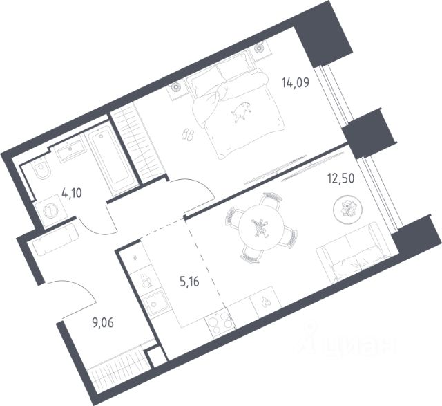 Общая площадь: 37,2 м2, Европланировка: кухня-гостиная 15 м2, спальня 14,6 м2, совмещенный санузел с ванной 3,3 м2, прихожая 4,4м2.