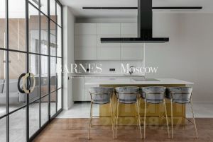 Придомовая территория поражает своей красотой и ухоженностью: среди вывмощенных дорожек возвышаются вечнозеленые ели и сосны, создавая атмосферу приватности в окружении живописного ландшафта. Фасад здания выполнен в классическом стиле с изящной лепниной, колоннами и балюстрадами, что подчеркивает высокий статус объекта.