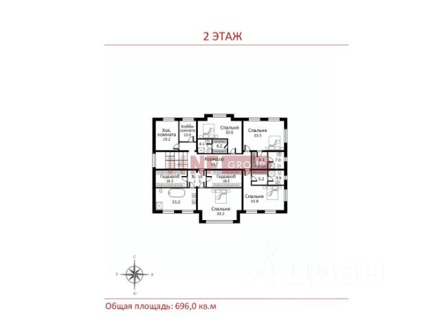 2-й этаж: лифт, холл (вторая гостиная), спальня со своим с/у и террасой, 3 спальни, 2 с/у