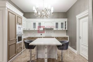 В доме: 3 спальни, холл с парадной винтовой лестницей и панорамными окнами высотой 9,1 м (тройной свет), кухня-столовая с выходом на террасу, гостиная с круговым дровяным камином в центре зала, кинотеатр с бильярдной, спа зона с сауной и хаммамом, спортивный зал на третьем этаже с панорамным видом на участок, постирочная, гараж на 2 машиноместа.