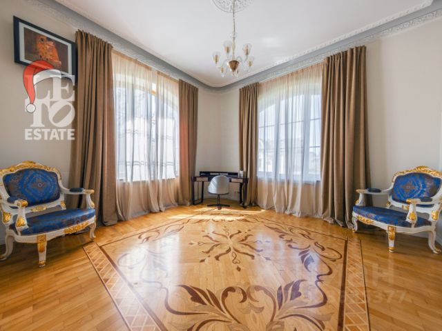 Украшением дома служит прекрасная мраморная лестница с коваными ограждениями и перилами из массива дуба. Высота потолков в комнатах 3,5 м. На полу наборный паркет из дуба. По всему первому этажу организован теплый пол, на втором в санузлах. На первом этаже есть гостевая спальня с санузлом, которая может быть использована в качестве блока для персонала. Отделка произведена ориентировочно в 2018 году.