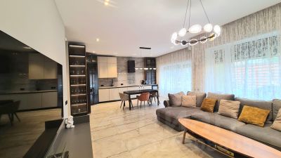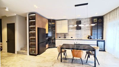 Выполнена внутренняя отделка "White Box" - выровнены и отштукатурены стены под финишное покрытие. Заведены и разведены теплые полы согласно проекту. Установлены алюминевые окна Kaleva. Сделаны выводы под кондиционирование. Выведены мокрые точки и установлены инсталяции.
