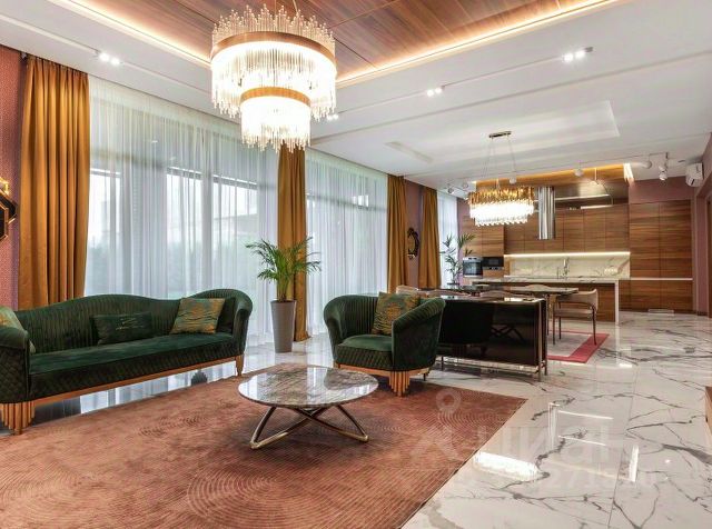 Диваны и кресла в гостиной Duresta (Англия). В столовой каменный раздвижной стол Draenert (Бельгия). В спальнях кровати Treca (Франция), диваны Meridiani. Гардеробы Rimadesio и Bernazzoli (Италия).