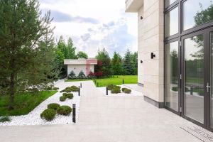 Резиденция стоит на участке с ровным рельефом и живописным ландшафтным дизайном в парковом стиле. На территории установлена беседка с мангалом, фонтан у въезда, сад камней с водопадом и фигурами ангелов, обустроены зоны современных грядок.