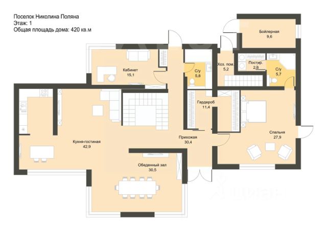 Лот 44699. Эксклюзив! Предлагается четырехуровневый дом с лифтом и бассейном, под чистовую отделку площадью 650кв.м. с разведенной инженерией на участке 14 соток в центральной части поселка Николина поляна. В доме установлено: Котел газовый 120квт Viessmann, насосные группы Meibes, внутрипольные конвекторы Mohlenhoff, трубчатые стальные радиаторы Zender, трассы ВК и ОВиК трубы Rehau, запорная арматура Rehau и Oventrop. Система очистки и подготовки воды Clack. Система автоматического поддержания давления в системе водоснабжения дома ESPA TECNO+. Приточно-вытяжная система с рекуперацией и подогревом воздуха в зимнее время. Приточно-вытяжная система с осушителем для бассейна Breezart Aqua. Кондиционирование центральное VRV-система Haier. Во всех санузлах смонтированы унитазы, душевые системы, гигиенические души и полотенцесушители производителей TECE, Grohe, Gessi, Villeroy&Boch, Jacob Delaphon. Парогенератор для хамама Tylo Steam Home. Оборудование бассейна PSH, теплообменник Max Dapra. Бассейн с противотоком. Оконные блоки Schuco, профиль 80мм, стеклопакеты 56мм. Лифт IFE Elevators электрический с полной защитой от застревания с автоматическими дверьми. Заведен оптический кабель - скоростной интернет и цифровое TV. Лестничные марши отделаны итальянским керамогранитом. Въездные ворота, калитка, ограждения балконов и флюгарки кованная сталь. На участке выполнен парковый ландшафт с мощением дорожек и площадок гранитной брусчаткой. Установлены автополив и ландшафтное освещение дорожек и деревьев. Высажено более 600 плодовых и декоративных деревьев и кустарников, включая 230 туй Смарагт-экстра. Подготовлены бетонные площадки под зону барбекю, спортивную площадку, теплицу и крытую автостоянку. 3D проект отделки "под ключ с мебелью" и визуализацией в подарок. 1 этаж: холл, гардеробная, тренажерный зал, гостиная с камином, зимний сад, столовая, кухня, кладовая, спальня, санузел 2 этаж: холл, спальня с гардеробной и санузлом, спальня с санузлом, мастер - спальня с санузлом и гардеробной Цоколь: холл, бассейн, хаммам, санузел, сауна, котельная, винная комната Мансарда: холл, спальня, санузел, постирочная, бильярдная, детская игровая, комната отдыха, гардеробная Эта местность особенно привлекательна для тех, кто любит природу, так как территорию поселка Николина поляна окружают красивые леса, переполненные чистейшим воздухом. В жаркий день эту местность наполняет прохлада, которая поступает от Москвы-реки и Истры. Территория постоянно охраняется и ведется видеонаблюдение. Попасть сюда возможно только через контрольно-пропускной пункт. Жителей и их гостей порадует ухоженность великолепного места. Все дороги имеют качественное асфальтированное покрытие. Имеется отличная спортплощадка, детские площадки и даже пруд. Служба эксплуатации постоянно ведет контроль за исправностью всех сетей.