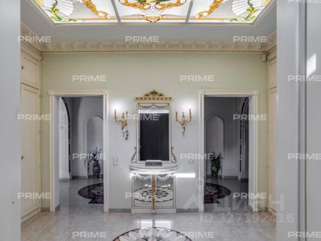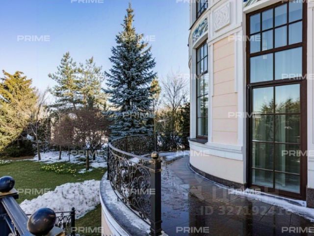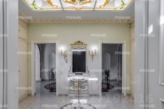 Придомовая территория поражает своей красотой и ухоженностью: среди вывмощенных дорожек возвышаются вечнозеленые ели и сосны, создавая атмосферу приватности в окружении живописного ландшафта. Фасад здания выполнен в классическом стиле с изящной лепниной, колоннами и балюстрадами, что подчеркивает высокий статус объекта.