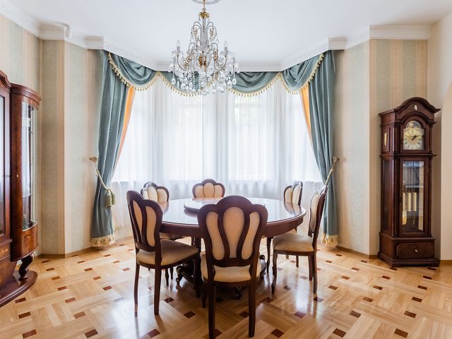 В основном доме: 4 спальни, просторная гостиная с камином, облицованным мрамором и выходом на террасу, мастер-спальня со вторым светом с высотой потолков 5,5 м, кухня, столовая, кабинет, 3 санузла, постирочная, гардеробные, чемоданная комната.