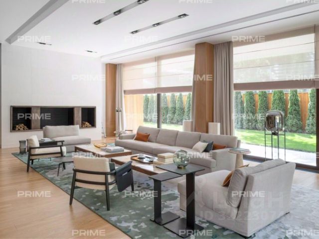 1-й этаж: На первом уровне расположены: Прихожая, гардеробная, просторная гостиная с камином, панорамным остеклением и выходом на террасу, столовая со столом на 10 персон, кухня с островом для завтраков и всем необходимым кухонным оборудованием, кабинет, гараж на 4 автомобиля.