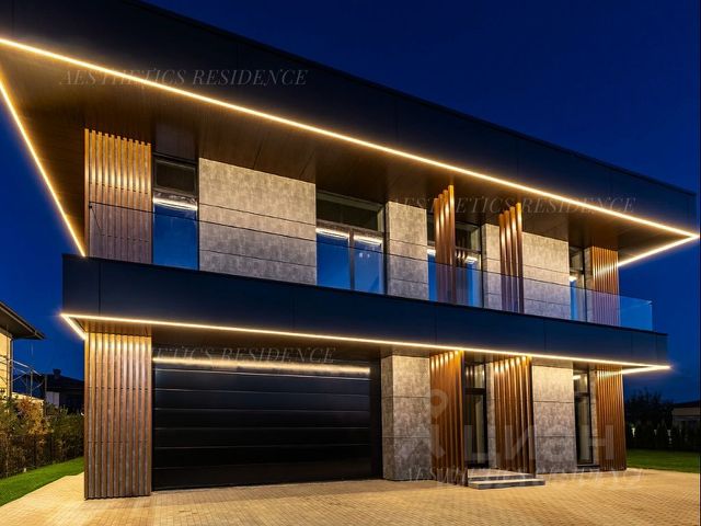 Концепция освещения включает мягкую подсветку фасада и террас, линейную подсветку свесов, ландшафтное освещение деревьев.