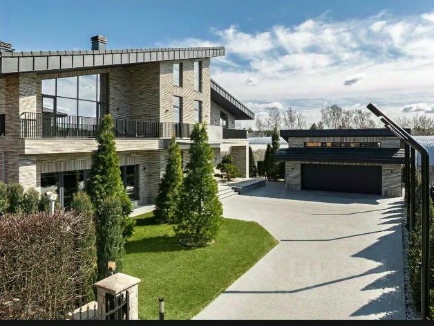 Фасад дома лаконичный и строгий, выполнен в светлой цветовой гамме. Торжественность резиденции добавляют два симметричных крыла, скрывающие просторный внутренний дворик от глаз соседей.
