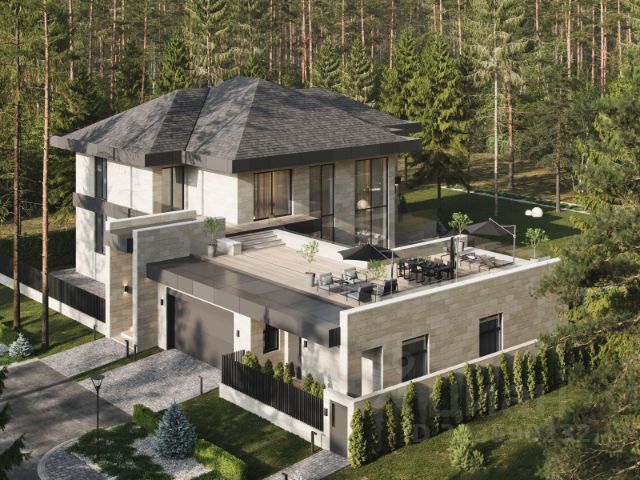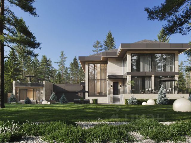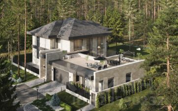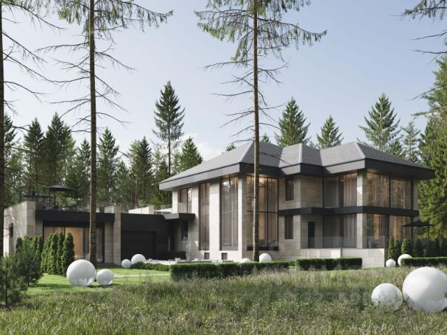 Современный дом без отделки 1050 кв.м. с плоской кровлей и большим панорамным остеклением, расположен в поселке Никольская слобода, самом близком из всех элитных поселков Новорижского шоссе.