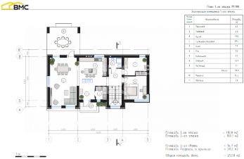 1 этаж: гостиная (48,3), столовая (23,5), кухня (11,5), спальня (13,7), прихожая (11,9), холл (13,5), постирочная (6,1), котельная (7,6), с/у (7,3).