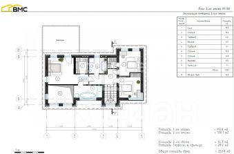 2 этаж: мастер-спальня (31,3) с гардеробной (4,9) и ванной комнатой (9,7), спальня (20,8), детская (18,8), кабинет (36), холл (13,2), ванная комната (7,6).