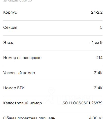 Заповедная 23 Корпус 2.10, секция 8, -1 этаж ,4 кВ - цена 480тыс. руб.
