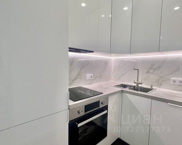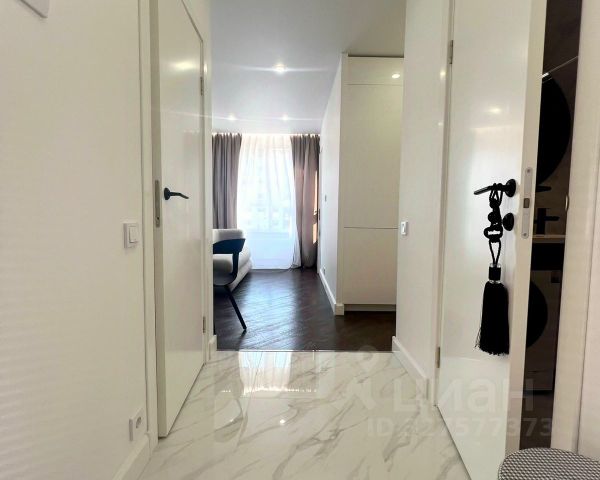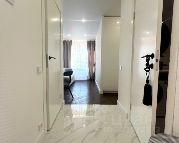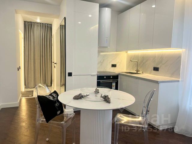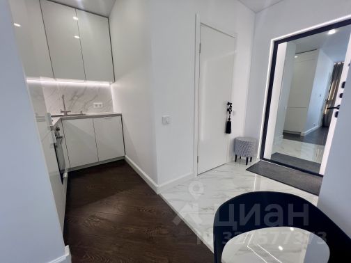 Квартира-студия со встроенной мебелью, шкафами в потолок (много мест для хранения) и большой рабочей зоной, установлена кровать-трансформер. Кухня компактно встроена по двум сторонам прохода (очень удобно), чтобы спрятать из жилой зоны и сохранить пространство. Зеркала до потолка на дверях шкафов.