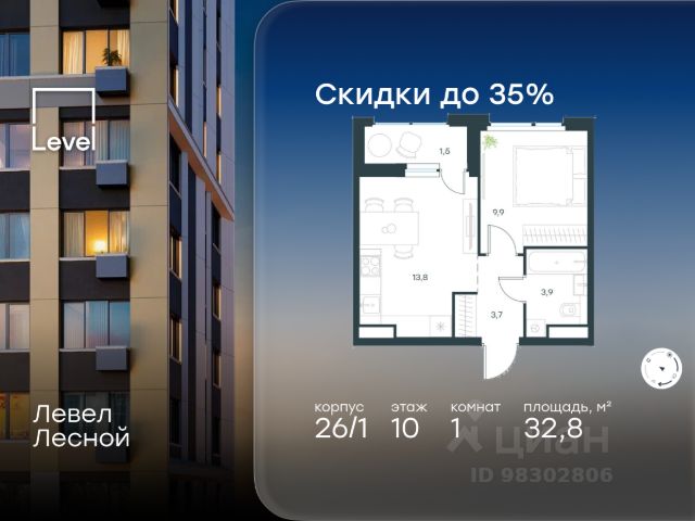 Цена указана с учётом скидки при 100%-й оплате, несубсидированной ипотеке, рассрочке (кроме программы "Рассрочка 0%"). В районе, утопающем в густой зелени лесов, многочисленных парков и скверов, продаётся 1-комнатная квартира площадью 32.80 кв.м с отделкой white box. Квартира расположена на 10 этаже в жилом комплексе комфорт-класса Левел Лесной (компания Level Group/Левел групп). Отличная транспортная доступность: - 25 мин. пешком до станции метро "Пятницкое шоссе"; - 28 мин. на автобусе до станции метро и МЦД-2 "Волоколамская"; - 11 мин. на авто до МКАД; - 25 мин. на авто до ТТК. Продуманный архитектурный проект: - Концепция проекта Левел Лесной от бюро СПИЧ; - Высотность комплекса до 15 этажей с уникальными видами на лесные массивы и город; - Высота потолков до 3 м; - Современные окна высотой до 1,6 м, в части квартир предусмотрены окна в пол. Высота подоконников 0,6 м; Расположение: Жилой комплекс Левел Лесной строится в зелёной зоне ближайшего Подмосковья, г.о. Красногорск в посёлке Отрадное. Шаговая и автомобильная доступность до метро и больших транспортных артерий города. За 25 минут вы дойдёте до станции метро "Пятницкое шоссе", а за 20 минут на машине сможете доехать до станции метро "Тушинская". Район окружен роскошной зеленью лесов и парковых зон, занимающих территорию свыше 1 000 гектаров. Помимо благоприятной экологии, здесь множество возможностей для активного отдыха и поддержания физической формы. Облагороженная территории с полностью развитой инфраструктурой. На территории проекта находится детский сад и школа "Светлые Горы", которая входит в список лучших частных школ от Forbes Education (по данным на 2023г.). Кроме того, в пешей доступности расположено ещё 8 детских садов, а также запланировано открытие современной муниципальной школы. В непосредственной близости находятся сетевые супермаркеты и локальные магазины, аптеки, клиники, почта, библиотека, салоны красоты, рестораны, спортивные и творческие секции, развивающие детские центры. В 12 минутах пешком расположен торговый парк "Отрада" с продуктовым и строительным гипермаркетами, магазинами, кинотеатром и развлечениями для детей. Внутренняя инфраструктура: Мы знаем, как важно, чтобы магазины и сервисы были всегда рядом. В сданных корпусах жилого комплекса Левел Лесной уже расположена полностью готовая развитая инфраструктура. На первых этажах корпуса 27 предусмотрено ещё 14 коммерческих помещений. Благоустройство: Продуманное пространство и аура приватного европейского городка рождают чувство лёгкости и расслабления у каждого, кто попадает на территорию проекта. Концепцию общественных площадок разработали в партнёрстве два архитектурных бюро: "Хайлайт Архитектура" (Highlight Architecture) и "Скейп" (Scape). В безопасных дворах без машин каждый обязательно найдёт себе место для вдохновения, отдыха и спорта.